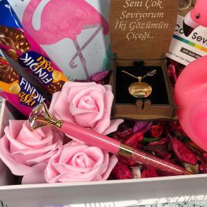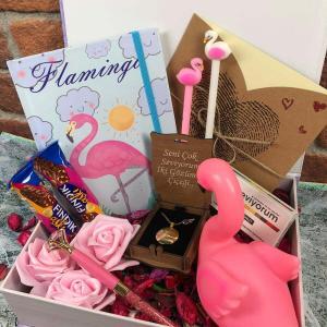 Flamingo Tasarımlı Kombin Set, içeriği oldukça çeşitlidir. Flamingo defteri, notlarınızı tutmanız için şık ve eğlenceli bir seçenek sunar. Fındıklı çikolatalar, tatlı bir lezzet deneyimi yaşamanızı sağlar. Pembe yapay güller, romantik bir atmosfer yaratırken uzun ömürlü bir hediye seçeneği sunar. Flamingo kalemler ve taşlı pembe kalem, yazı yazarken stilinizi ve şıklığınızı konuşturmanıza olanak tanır. Ahşap kutulu kişiye özel kolye, sevdiklerinizi özel hissettirecek ve onlara hatırlanacak bir hediye sunar. Pembe flamingo gece lambası, dekoratif bir aydınlatma öğesi olarak kullanılabilir ve odanıza eşsiz bir atmosfer katmaya yardımcı olur. Çok seviyorum kutusu, duygularınızı ifade etmenizi sağlayan romantik bir detaydır. Aşk fermanı, sevginizi ifade etmek için özel olarak tasarlanmıştır. Gül kuruları ve aşk sözleri ise romantik bir dokunuş sunar.
