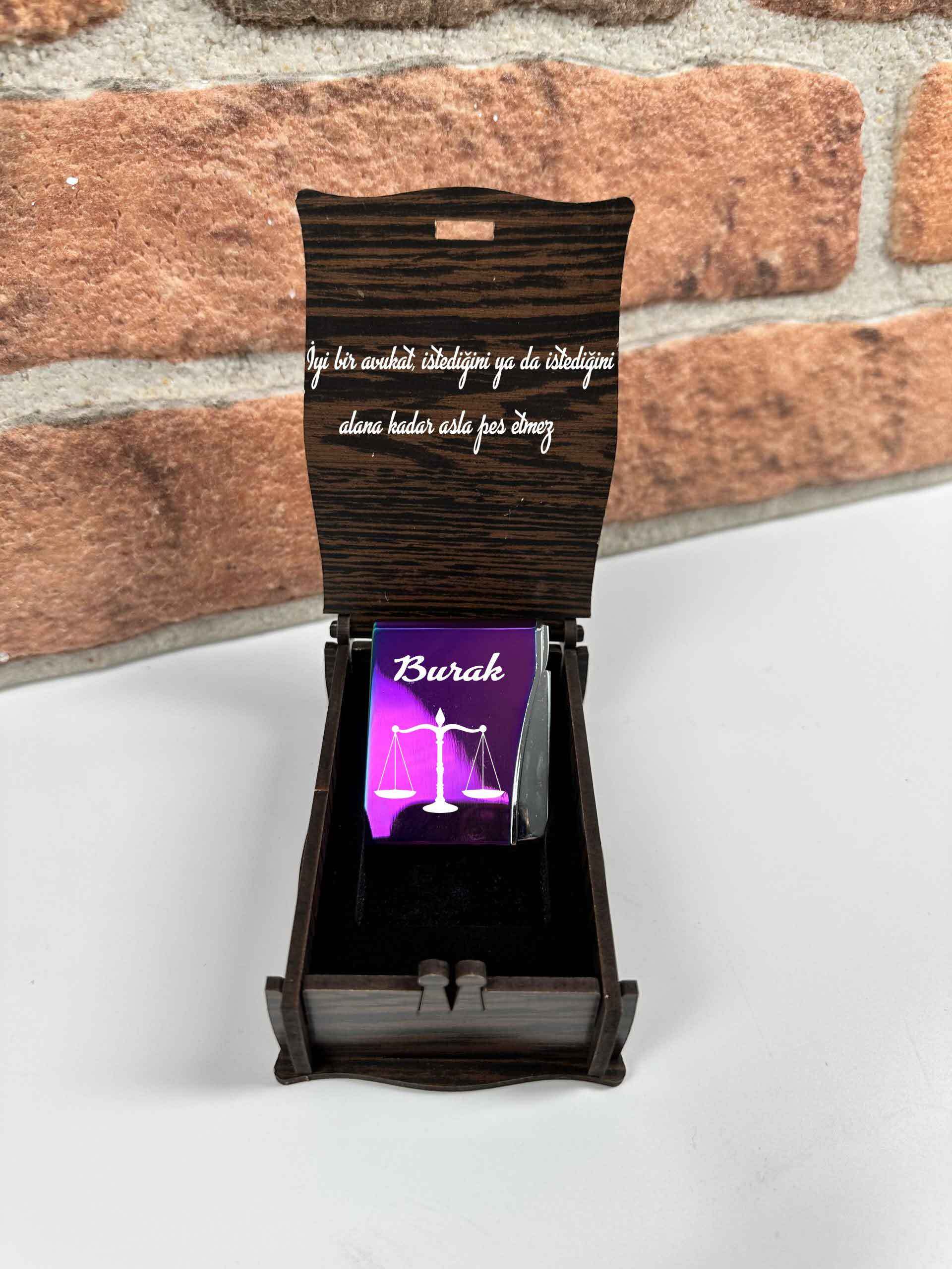 Kişiye Özel Avukat Tasarımlı Ahşap Kutulu Rüzgarda Sönmeyen Hologram Çakmak
