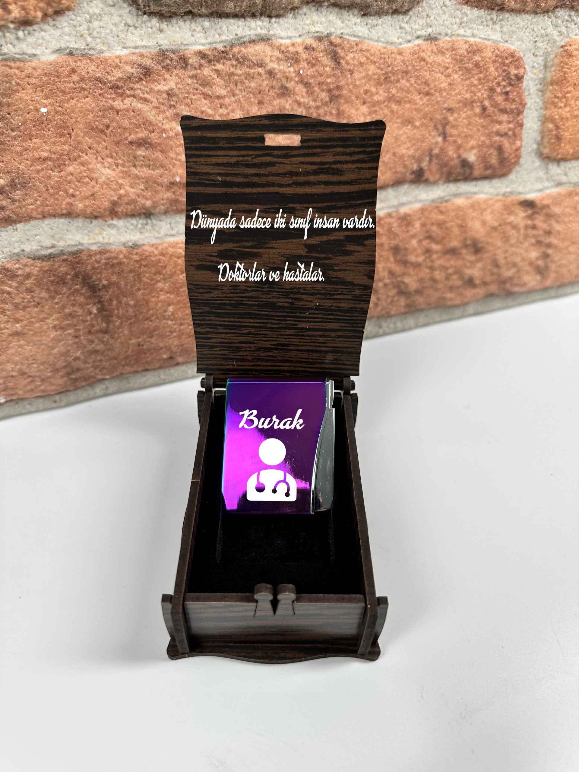 Kişiye Özel Doktor Tasarımlı Ahşap Kutulu Rüzgarda Sönmeyen Hologram Çakmak