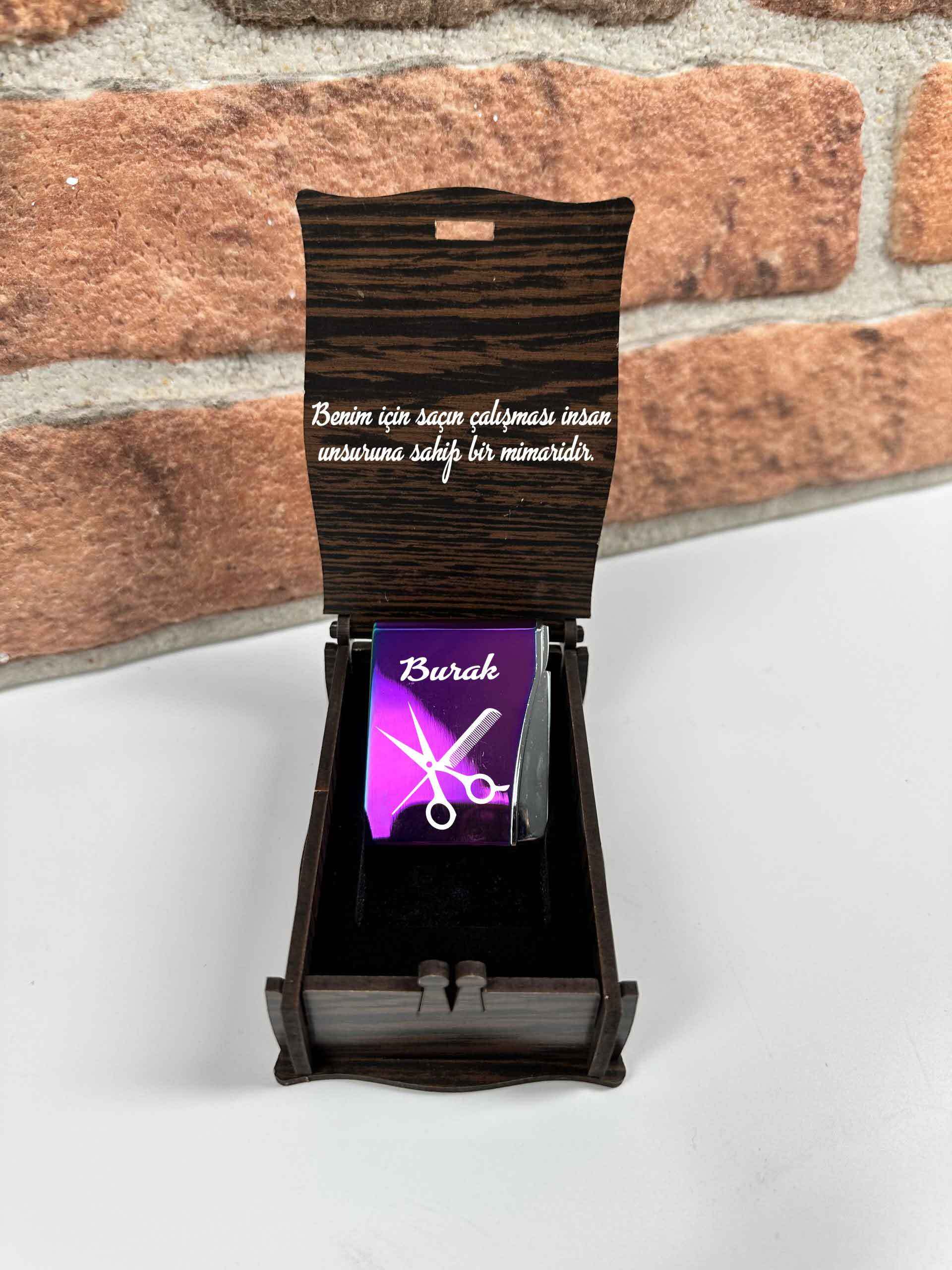 Kişiye Özel Kuaför Tasarımlı Ahşap Kutulu Rüzgarda Sönmeyen Hologram Çakmak