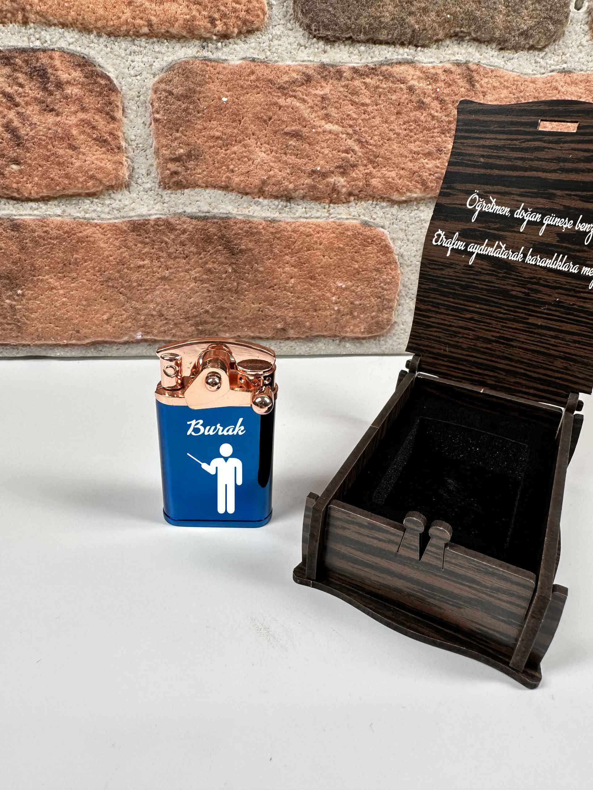 Kişiye Özel Öğretmen Tasarımlı Ahşap Kutulu Mavi Gold Detaylı Çakmak