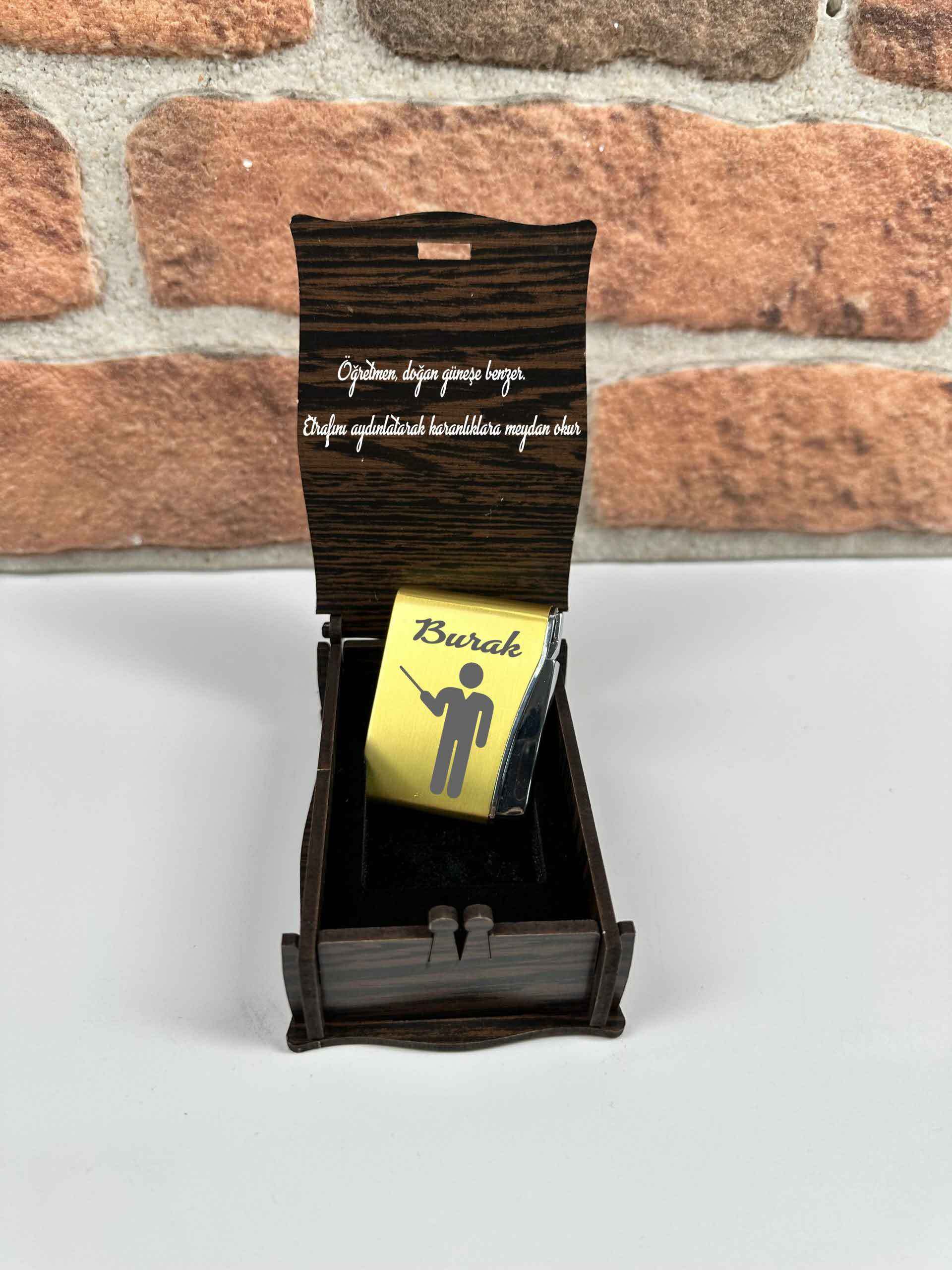 Kişiye Özel Öğretmen Tasarımlı Ahşap Kutulu Rüzgarda Sönmeyen Sarı Çakmak