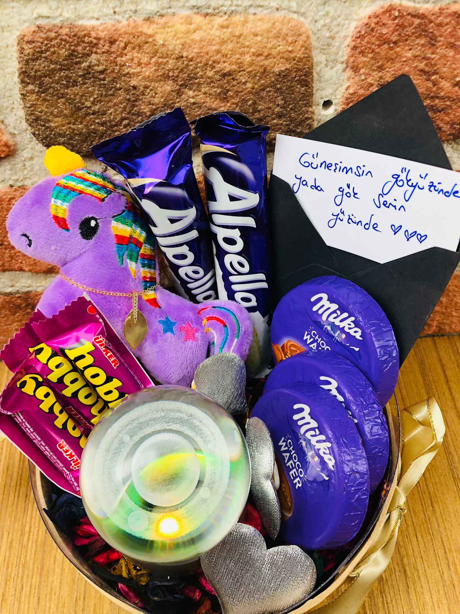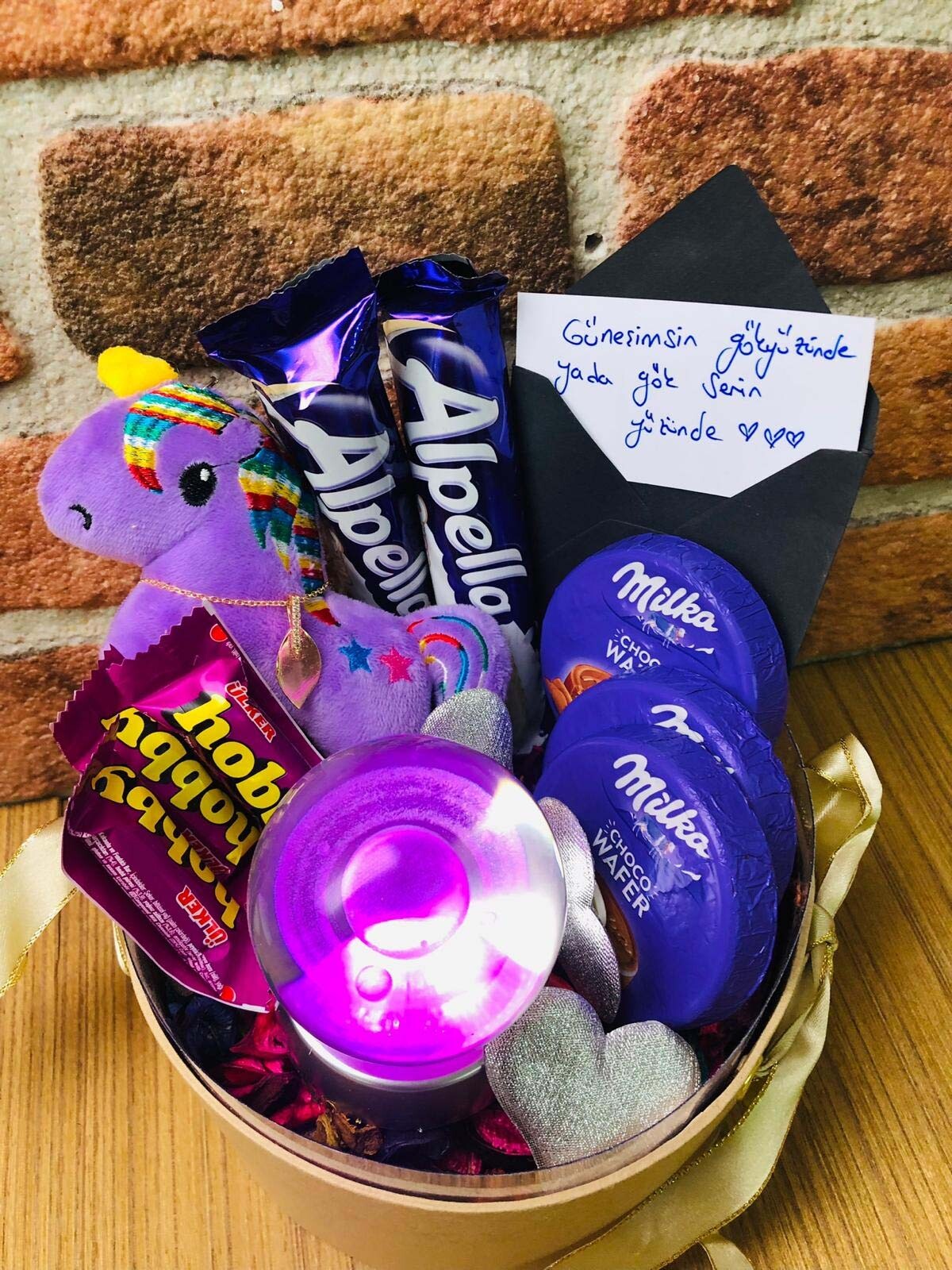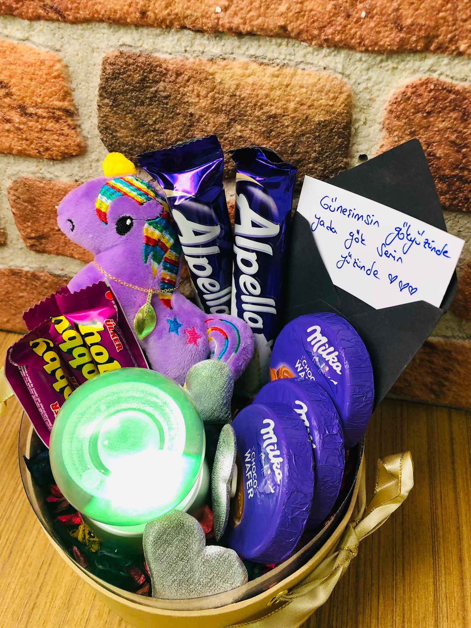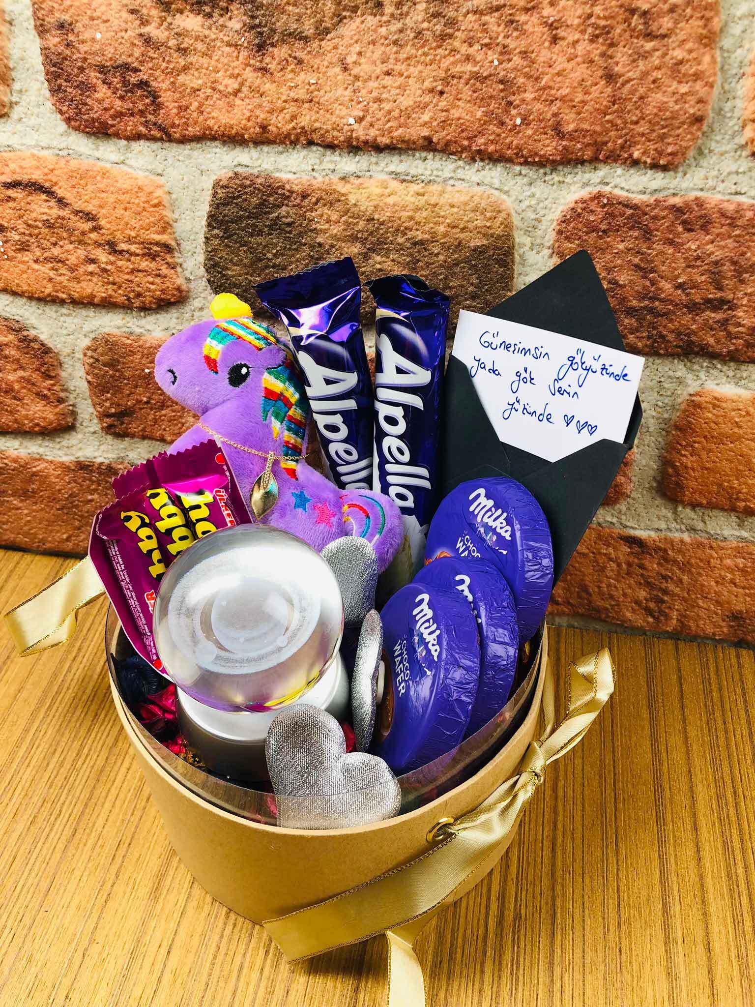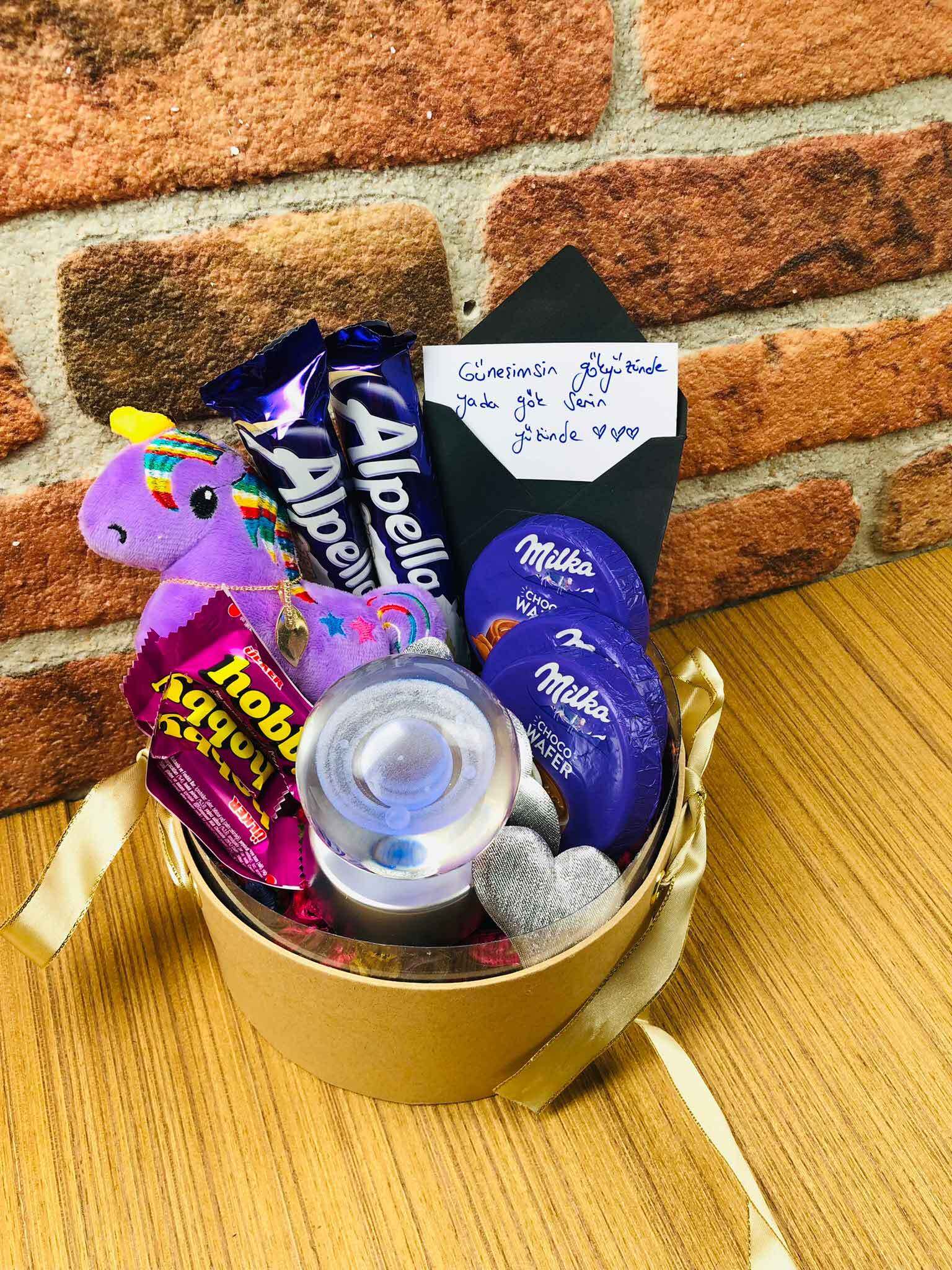sevdiklerinize unutulmaz bir hediye deneyimi sunmak için tasarlanmış özel bir hediyeliktir. İçeriğinde bulunan ışıklı küre, peluş unicorn, çikolata çeşitleri ve not zarfı ile sevdiklerinizin kalbini ısıtacak bir hediye sunmanın en zarif yoludur.
