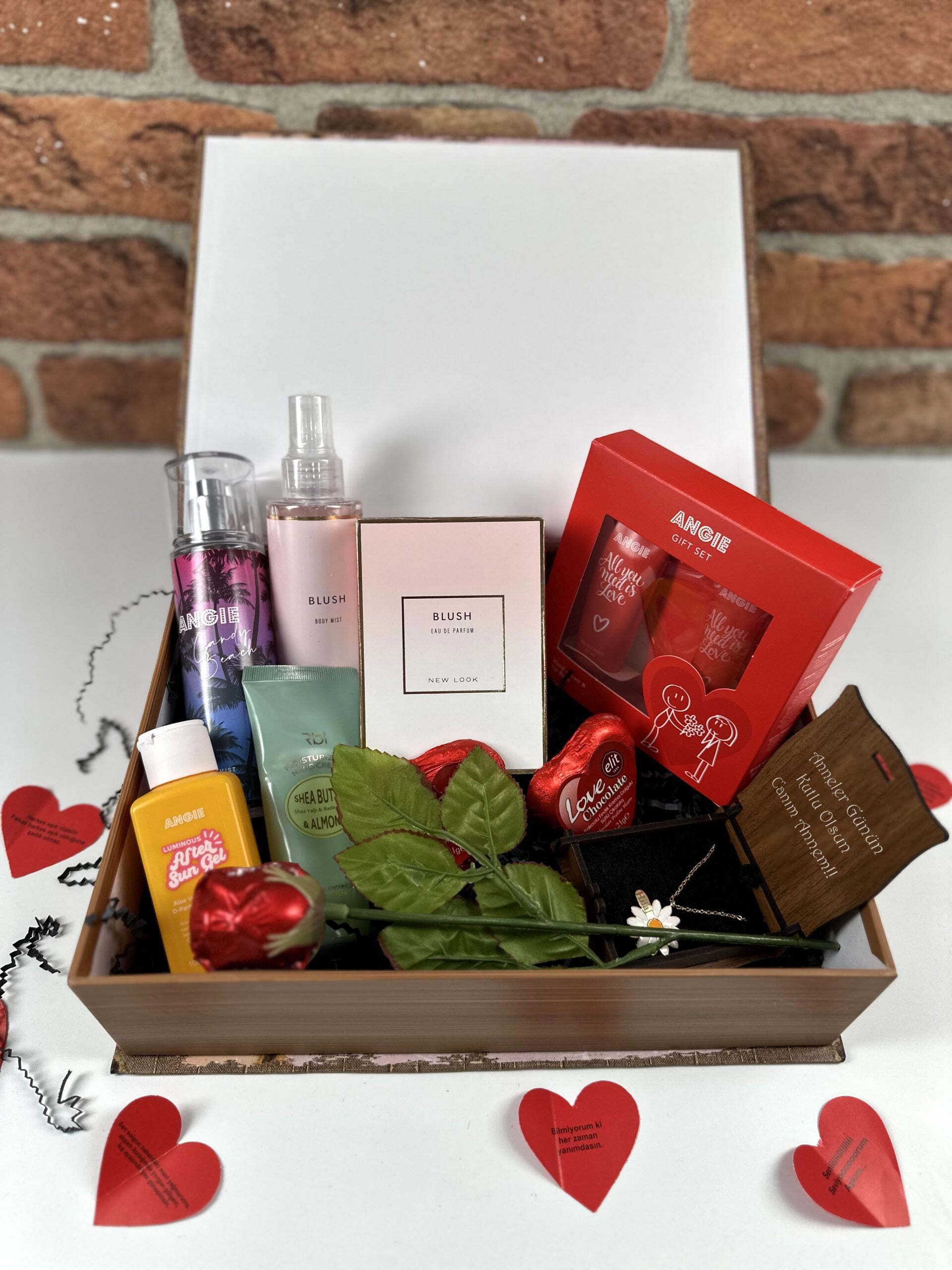 Bu seçkin hediye seti, kız arkadaşınıza özel bir armağan sunmak için tasarlanmıştır. Rebul Blush parfüm, Angie vücut losyonu, Blush vücut spreyi, Shea Butter nemlendirici krem, Angie aloevera ve C vitamini jel, Hand Cream, Lip Balm Angie Set, Elit Gül Çikolata, Elit Kalp Çikolatalar, ahşap kutulu papatya kolye ve aşk sözleri, bu setin içeriğinde yer alan ürünlerden bazılarıdır.