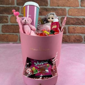 Pembe Silindir Hediye Kutusu, içeriğindeki özenle seçilmiş ürünlerle sevdiklerinize sevginizi ve şıklığı sunuyor. Bu özel kutu, tatlı sürprizleriyle hem göze hitap ediyor hem de kalbe dokunuyor.