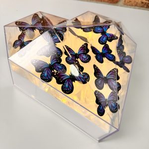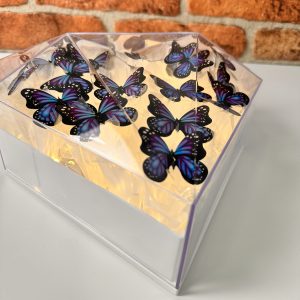 Prizma Kalp Kutulu Ledli Mavi Kelebek Set,romantik bir hediye seçeneği olarak öne çıkar. Bu özel ürün, 18 adet ledli kelebekten oluşan bir tasarıma sahiptir ve kutu üzerindeki prizma deseniyle göz alıcı bir görünüm sunar. Ürün boyutları 35×35 cm’dir, bu da onu dikkat çekici bir dekorasyon parçası haline getirir.