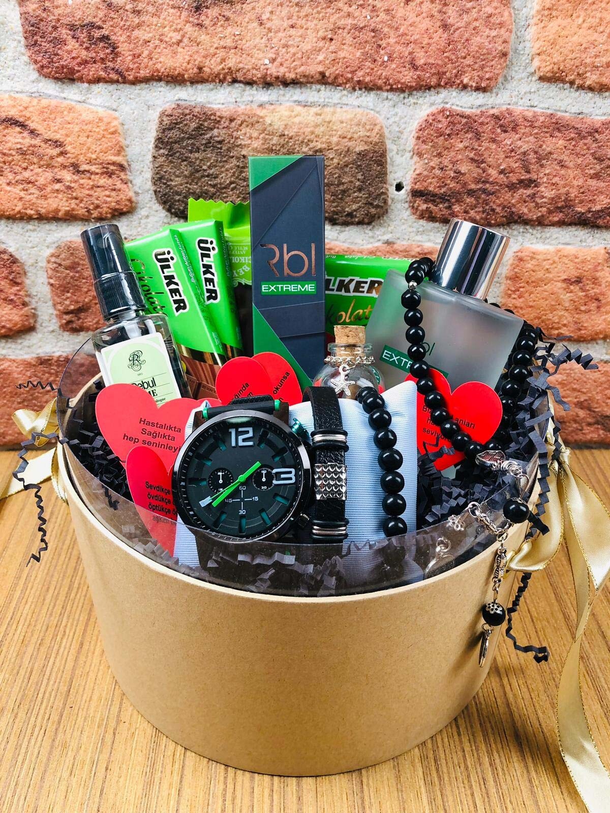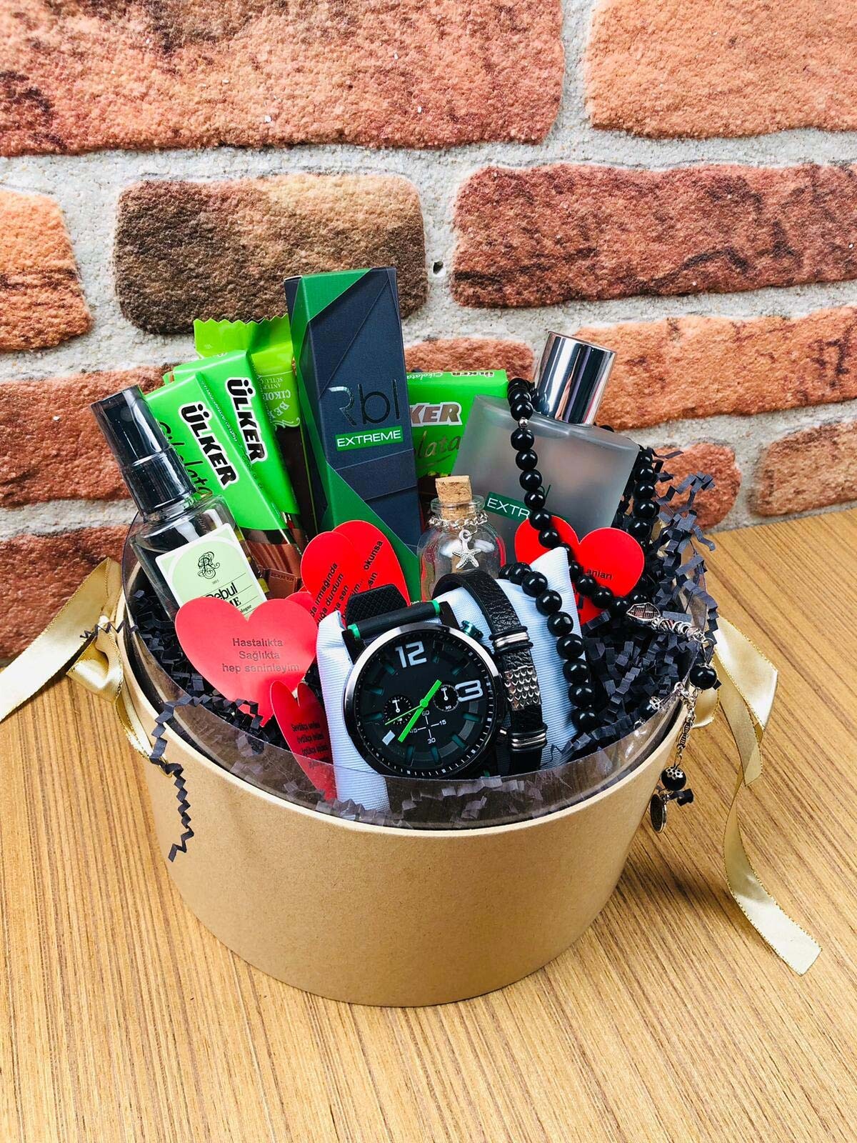 Yeşil Konsept Erkek Set, içeriğinde birbirinden şık ve anlamlı ürünleri barındırıyor. Bu özel setin içeriğinde 1 adet özel seçilmiş parfüm, 1 adet sprey, 1 adet modern tasarımlı saat, 2 adet bileklik, çikolata çeşitleri ve zarif bir cam tüp yer alıyor. Bu zengin içerik, seti alacak kişiyi hem görsel hem de duygusal olarak tatmin ediyor.