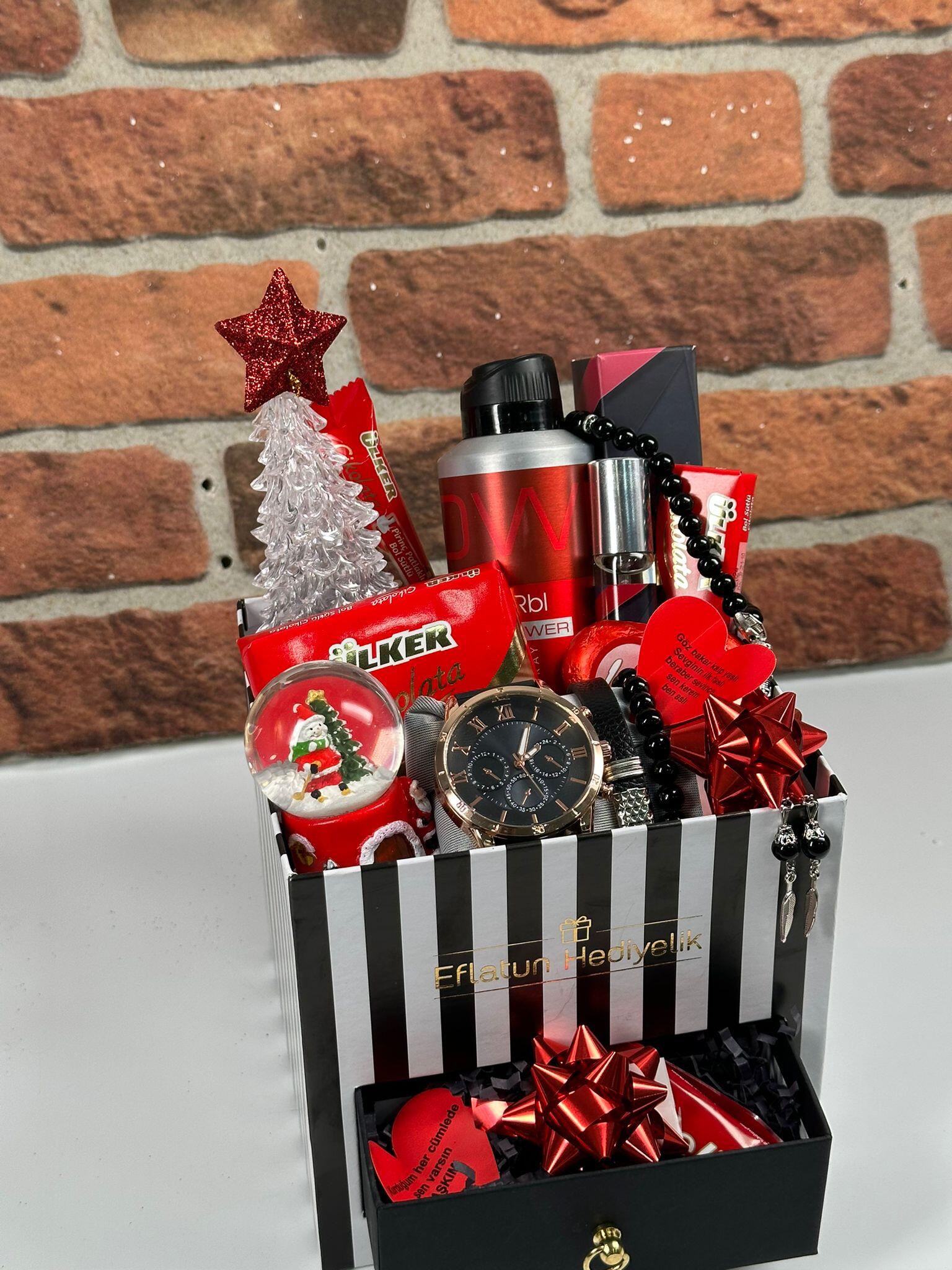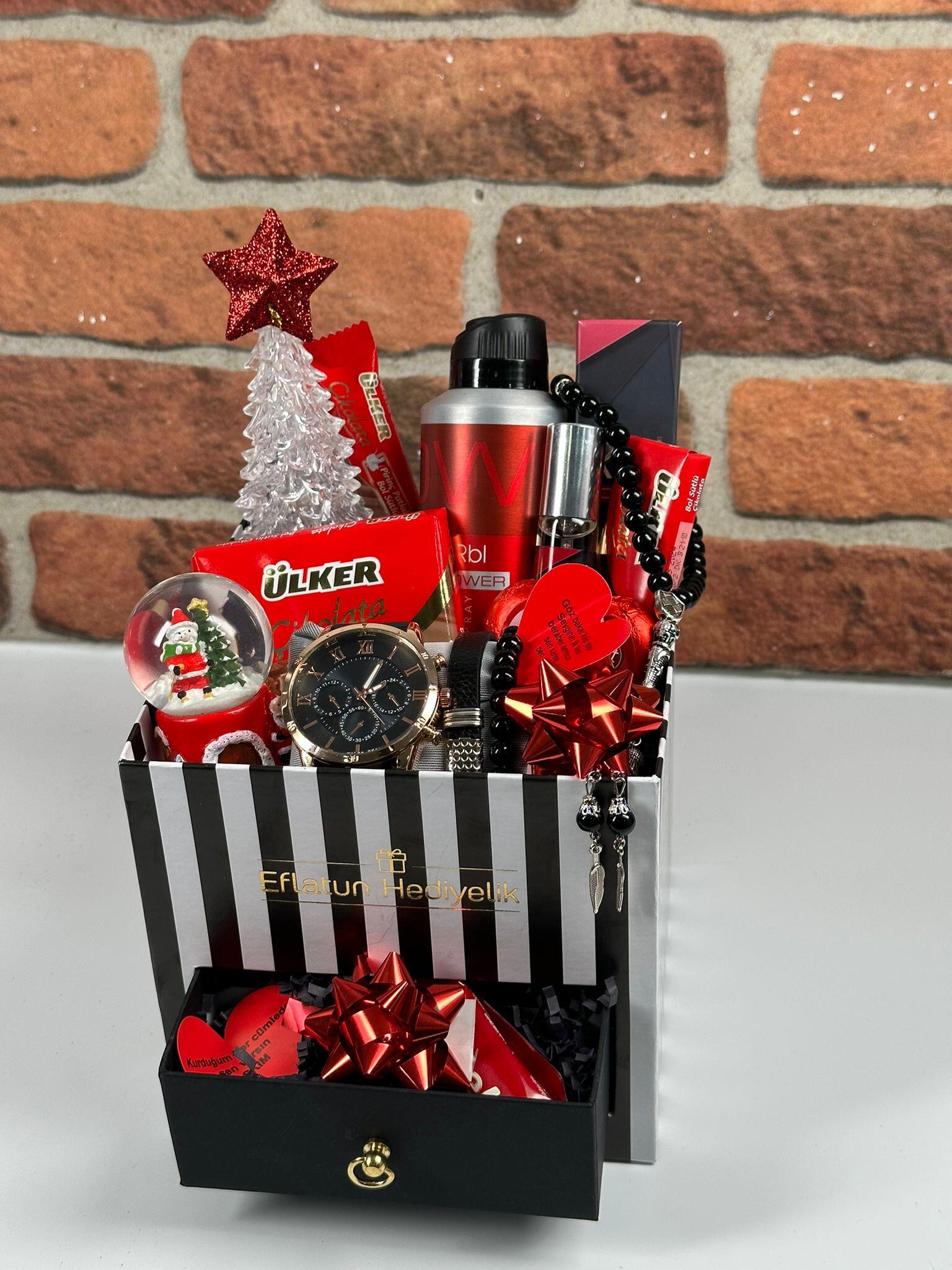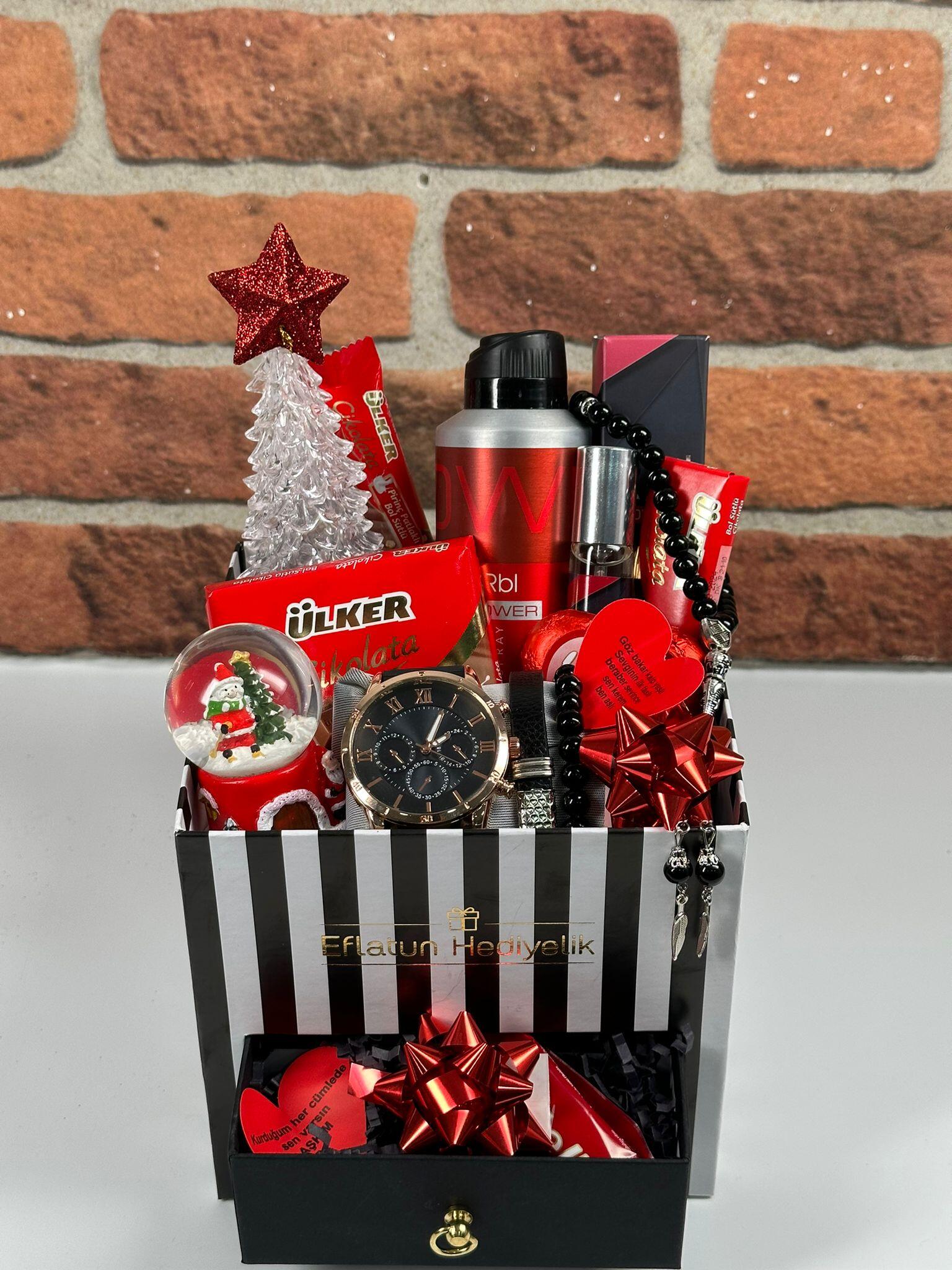 Setin diğer bileşenleri arasında, özel olarak tasarlanmış bir saat, bir bileklik, yılbaşı temalı aksesuarlar ve lezzetli atıştırmalıklar bulunur. Bu öğeler, erkeklerin tarzını yansıtan ve yılbaşı ruhunu yaşatan detaylardır. Sevdikleriniz için hem şık bir aksesuar hem de eğlenceli bir deneyim sunan bu set, yılbaşı kutlamalarını daha da özel kılar.